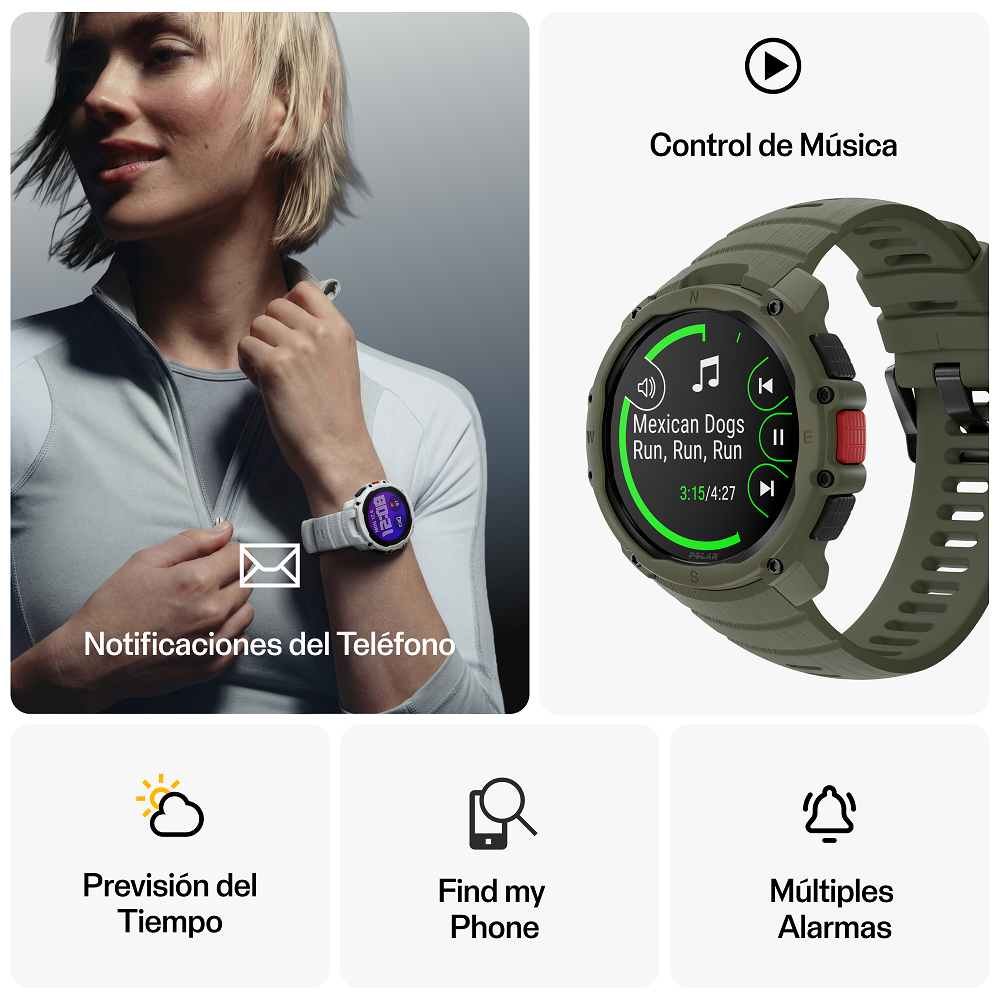 Street X es un reloj deportivo urbano en esencia, pero incorpora funciones prácticas para el día a día — desde notificaciones y alarmas hasta control de música, actualizaciones meteorológicas y la opción de encontrar tu teléfono cuando lo necesites.