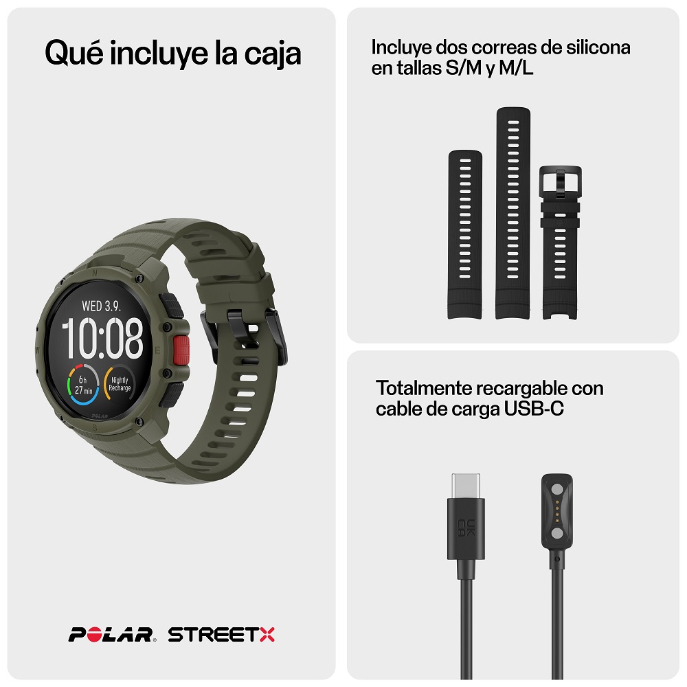 POLAR Street X es un reloj deportivo urbano ligero y resistente que potencia tus entrenamientos y se integra sin esfuerzo en la vida diaria. Cuenta con una brillante pantalla táctil a color AMOLED, GPS fiable, registro preciso de la frecuencia cardíaca y una linterna LED integrada con modo de luz roja para mayor visibilidad en condiciones de poca iluminación.