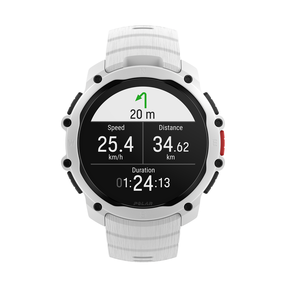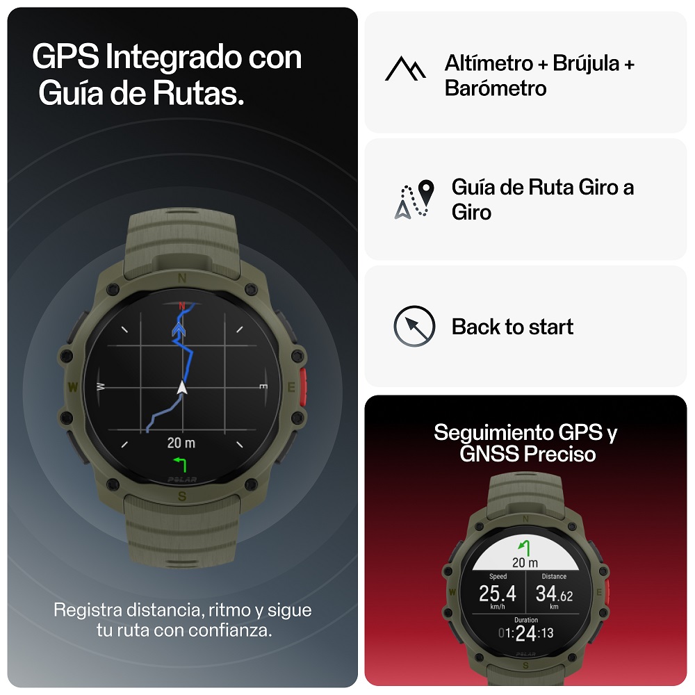 Guía de Rutas Giro a Giro – Sigue tus rutas planificadas directamente en el reloj con alertas claras en cada giro. Mantente en el camino por calles urbanas o senderos desconocidos, para que puedas centrarte en la sesión — y no en dónde girar después.