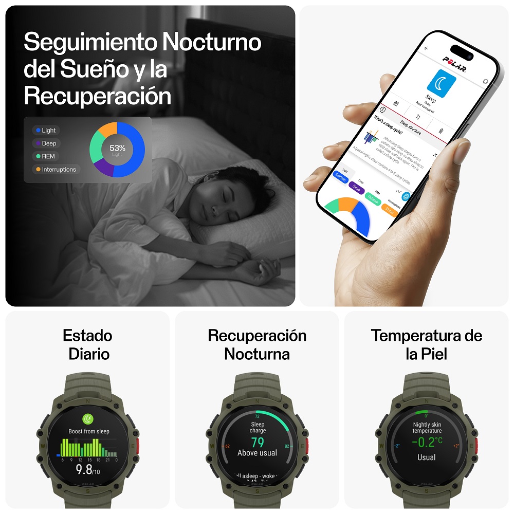 Seguimiento del Sueño – Comprende cómo has dormido realmente. Cada noche se miden automáticamente la duración, calidad, fases e interrupciones del sueño, ofreciéndote una puntuación clara y un desglose del sueño ligero, profundo y REM. Te ayuda a ver cómo son realmente tus noches.